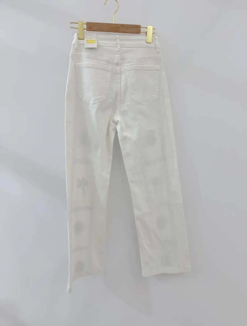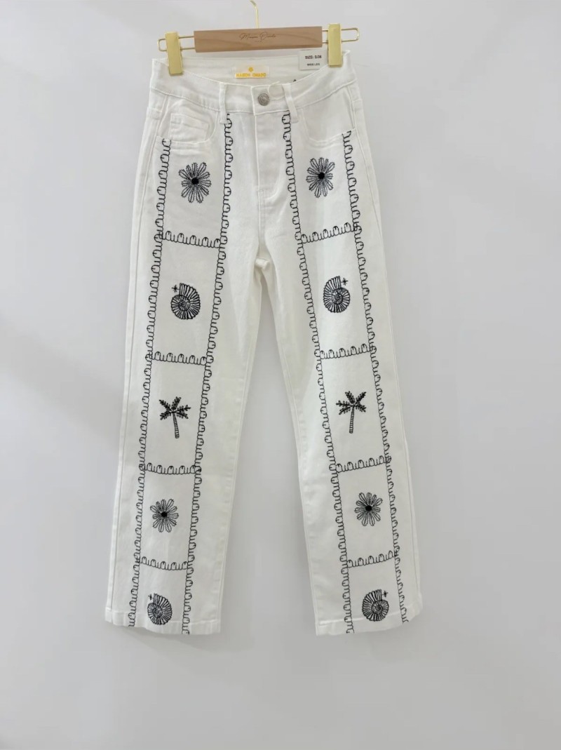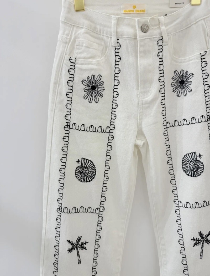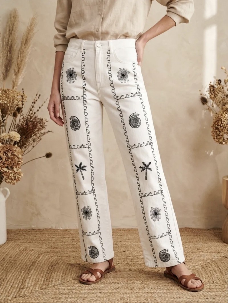 Jean blanc femme avec broderies bleu marine élégantes. Une pièce chic et originale qui sublime vos tenues avec style et modernité.